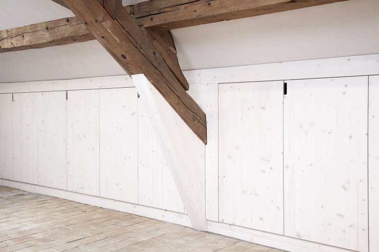 Maison Rosset - agencement combles Maître d'ouvrage: privé Caisses en mélaminé blanc Faces visibles en épicéa trois-plis, teinte blanche En collaboration avec RGB Architectes 2019